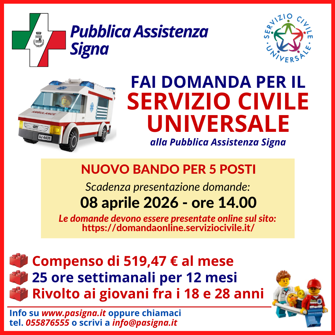 Per fare domanda alla Pubblica Assistenza Signa si può scegliere il progetto "Soccorso Firenze e Prato 2025" (codice PTXSU0005725011891NMTX e codice sede 147753) che prevede attività di emergenza e trasporto sanitario ordinario oppure il progetto “Assistenza Firenze e Prato 2025” che prevede attività di trasporto sanitario ordinario e sociale (codice PTXSU0005725013475NMTX e codice sede 147753).
